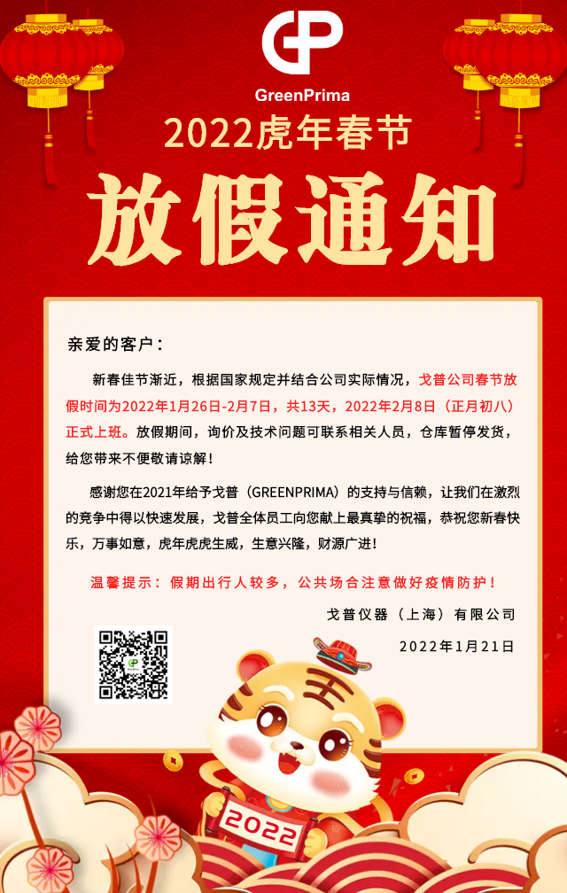 歡歡喜喜迎虎年!戈普公司春節(jié)放假時間為2022年1月26日-2月7日,共13天,放假期間,有詢價或技術(shù)問題請撥打相關(guān)人員移動電話,倉庫暫停發(fā)貨,給您帶...