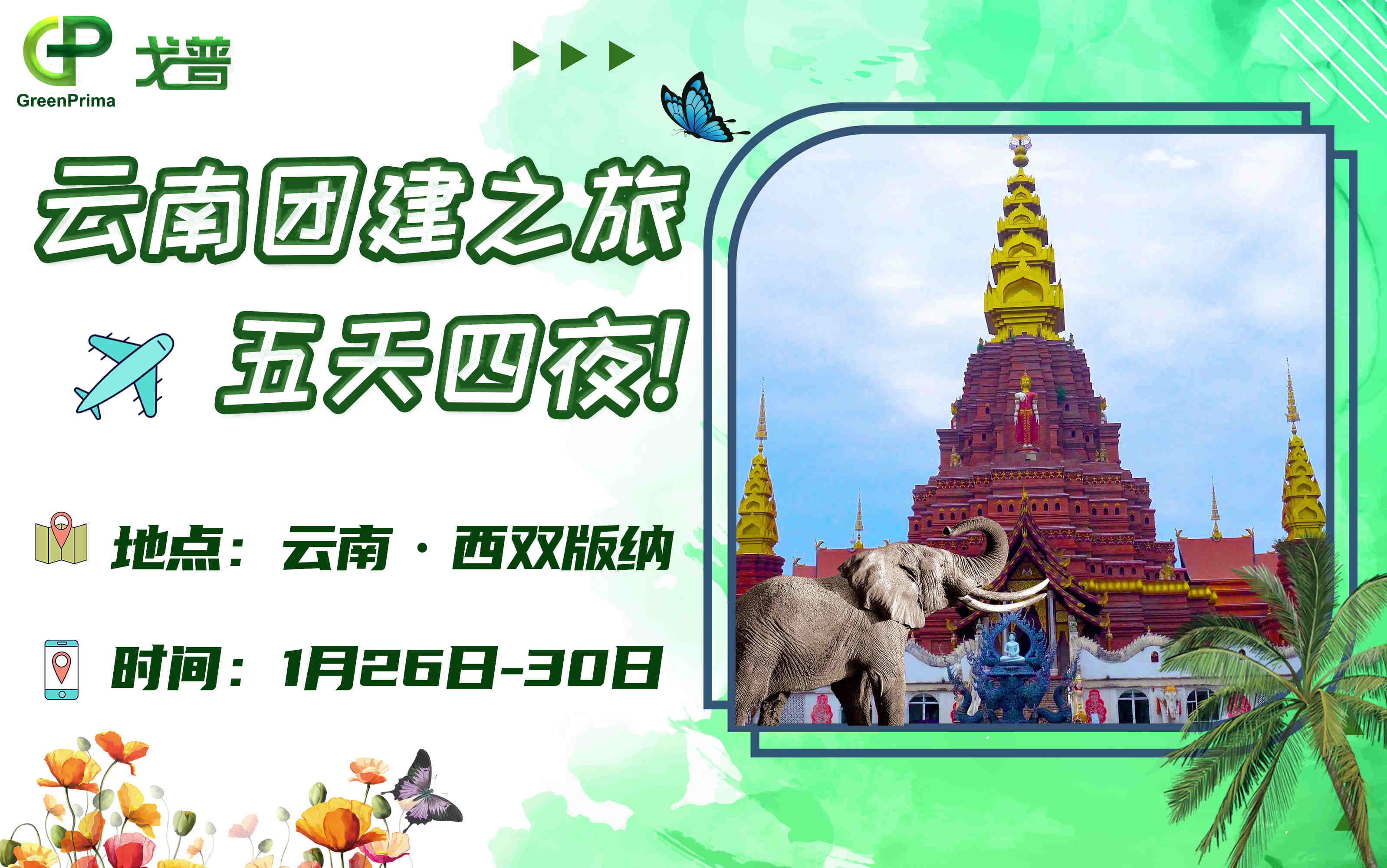 戈普公司將于2024年1月26至30日進行五天四晚的西雙版納團建活動,請各位同仁安排好手頭工作,向快樂出發(fā)!